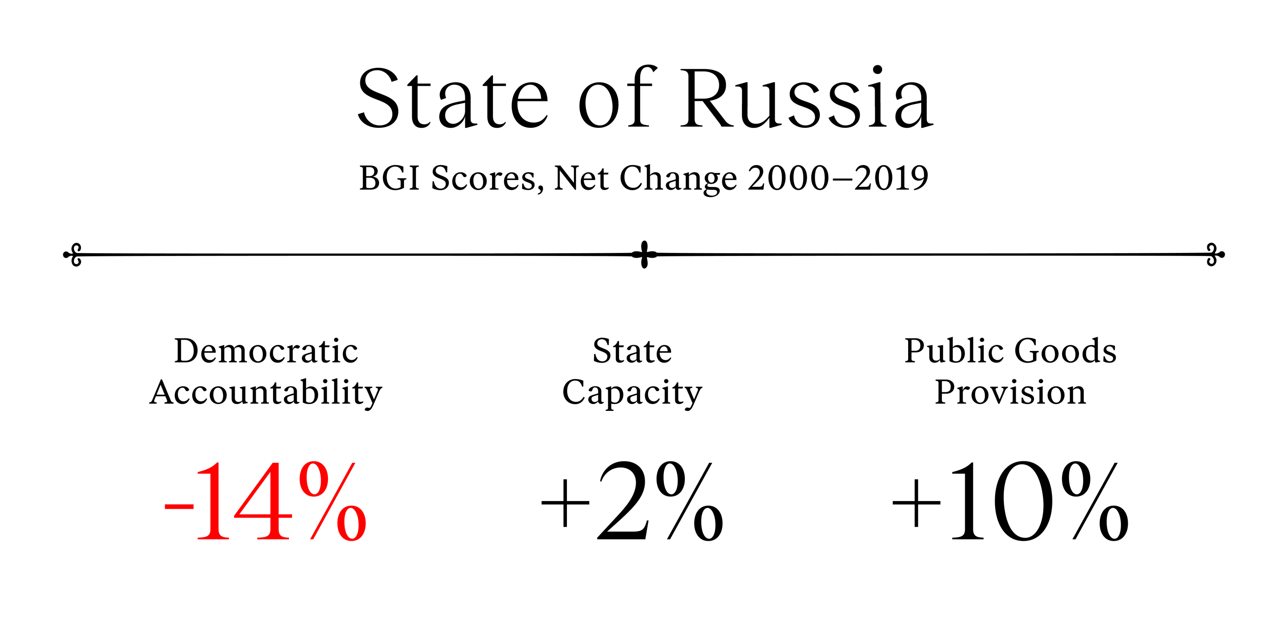 Alongside the decline of institutional and electoral accountability under Putin, the BGI's sub-index for societal accountability also shows a downward slide. Lack of free press further insulates Russia's autocratic institutions.